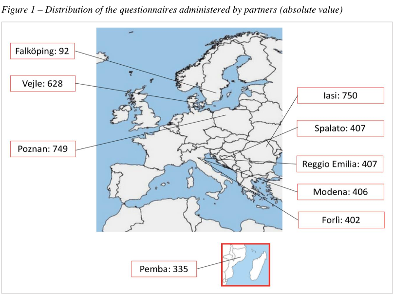 To investigate citizens’ opinion and knowledge about the SDGs, migration, gender equality, climate change, and the role their city should play for sustainable development, a survey was run between July and September 2018 by twelve of the Shaping Fair Cities (SFC) project partners: in the EU (Forlì, Modena and Reggio Emilia in Italy; Vejle in Denmark; Patras in Greece; Alicante in Spain; Iasi in Romania; Split in Croatia; and Poznań in Poland) and in two co-applicant partner countries (Scutari in Albania; and Pemba in Mozambique).
